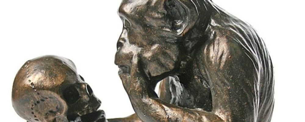 On Lenin’s desk in the Kremlin there stood, for most of the years he worked there, a strange bronze statue of an ape gazing with an expression of profound bewilderment and dismay at an oversize human skull. It stood about ten inches high, and occupied a dominating position on the desk behind the inkwell. The ape was sitting, or rather squatting, on a heap of books in a posture which is a grotesque parody of Rodin’s Le Penseur. There is nothing in the least amusing about the appearance of the ape, which is sordidly bestial, with its small head and great curving shoulders and long dangling arms; and the human skull, with gaping mouth and empty eye sockets, is even less amusing. The ape gazes ponderously at the skull, and the skull gazes back at the ape. We can only guess at the nature of the interminable dialogue which is being maintained between them